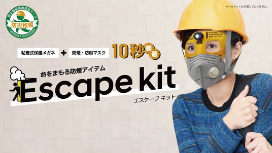 エスケープキットは、サッと素早く装着できる粘着式保護メガネと手軽でありながら高性能な防煙・防粉マスクが一つのパッケージに同梱されており、目と呼吸器を保護しながら、安全な避難をサポートします。