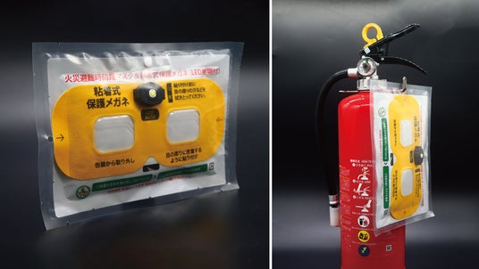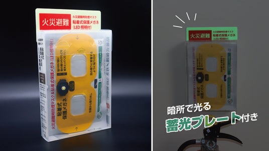 粘着式保護メガネ×1個、防煙マスク×1個のセット。消火器などの消火ツールと一緒に備えるのがおすすめです。販売価格:3,600円(税別)