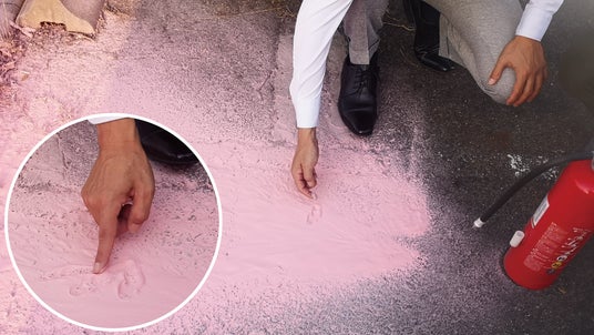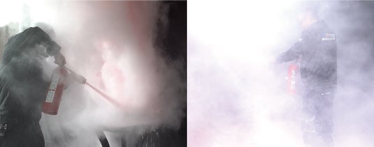 実際に消火器を放射した様子。使用に慣れていないと、消火剤を大量に浴びることに。