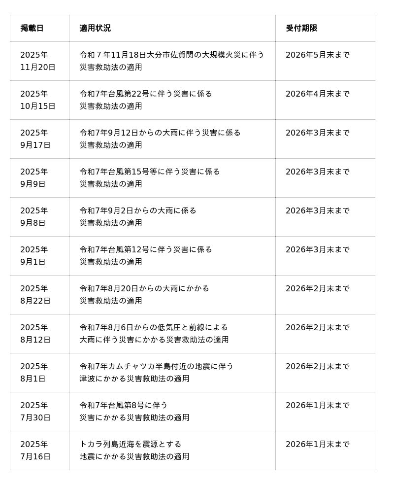 ※災害救助法適用地域の最新情報は内閣府のホームページにてご確認ください。
