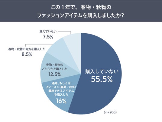 過去1年の購入状況では、春物・秋物をまったく購入していない人が過半数(55.5%)と半数以上にのぼりました。