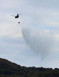 県警と地元消防は20日、現場検証を始めた。出火原因の特定や焼損状況の確認を進める。20日も自衛隊のヘリコプターが散水する様子が見られた。現場からは19日、性別不明の遺体が見つかり、連絡が取れていない住民男性(76)とみて身元確認を進めている。