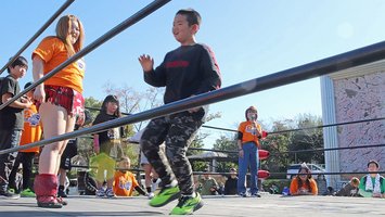 岐阜市拠点のプロレス団体「柳ケ瀬プロレス」の選手らが出演するチャリティーイベント「いじめ撲滅・元気創造」が、同市長良福光の岐阜メモリアルセンター芝生広場で開かれた。プロレス教室やチャリティーマッチが行われ、子どもら来場者が「いじめノックアウト」を誓った。