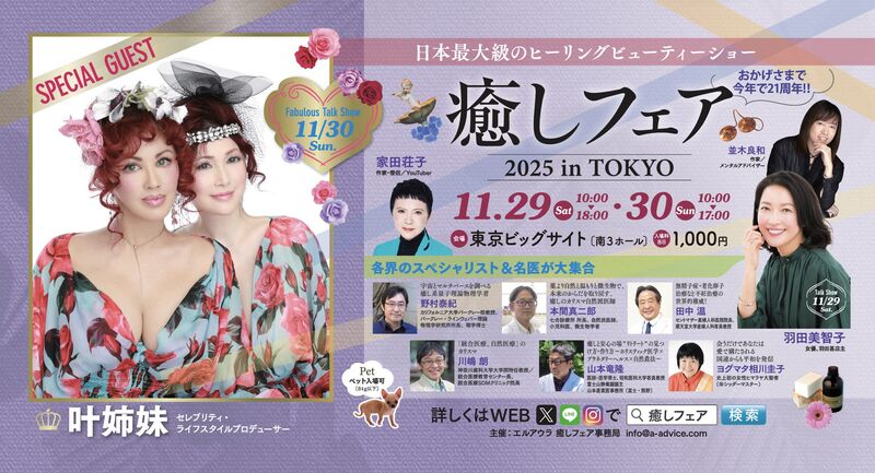 株式会社エルアウラ(本社:東京都港区、代表取締役社長:橘川達也、以下エルアウラ)は、11 月29日(土)11月30日(日)に東京ビッグサイトにて今年で21年目となる、心とカラダそして地球にやさしい癒し関連の商品・サービスが一度に体感できる総合見本市、『癒しフェア2025 in TOKYO(https://www.a-advice.com/tokyo_2025/)』を開催いたします。