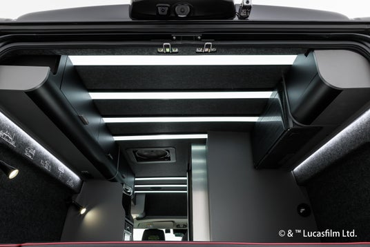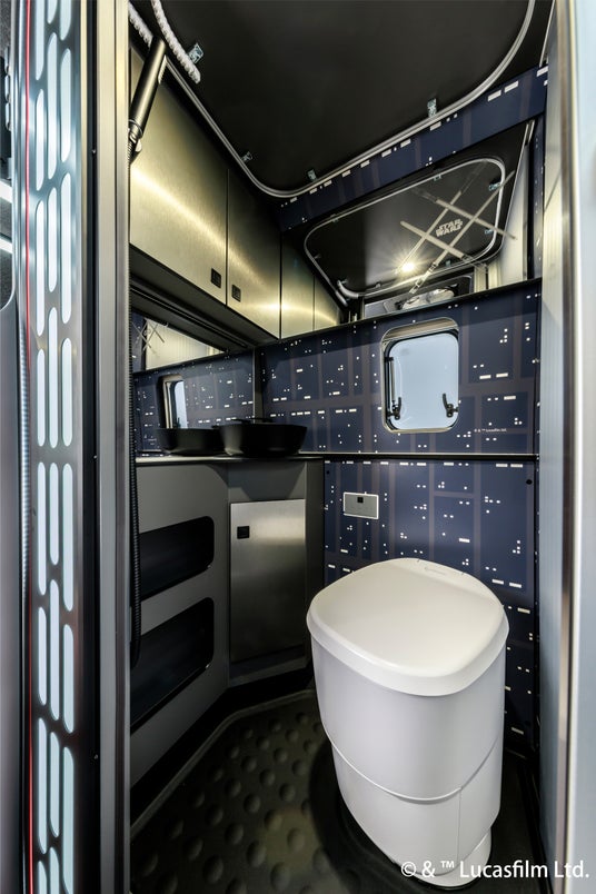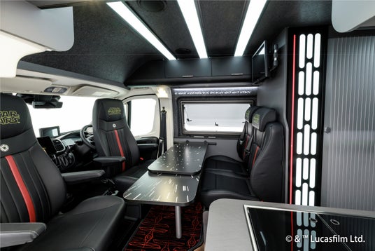 車内に足を踏み入れれば、そこはもう「スター・ウォーズ」の銀河。キャンピングカーの内外装には、帝国の象徴「ダース・ベイダー」や、巨大な戦闘基地「デス・スター」を彷彿とさせる、帝国軍のダークで荘厳な世界観を細部にわたって表現しました。
