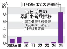 百日ぜきは激しいせきが特徴で、今年は11月9日までに累計患者数が8万5千人を超えた。現在の集計法となった2018年以降で最多だった19年の5倍以上で、患者は10代以下が多い。特に乳児は、けいれんや呼吸停止といった症状に進展し、肺炎や脳症で死亡することもある。