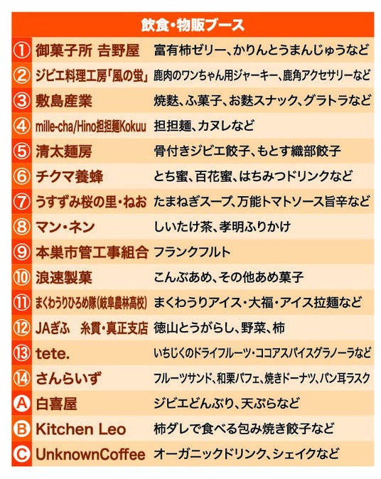 本巣市の特産品である柿やジビエを使ったグルメが並びます。