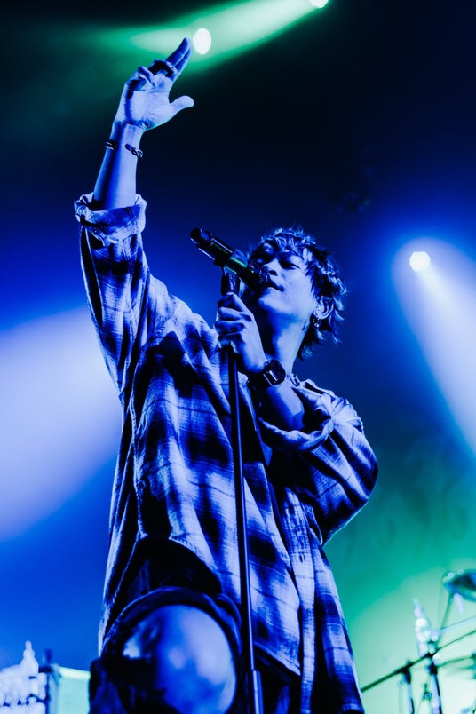 開演時間ジャストに落とされた照明に、満員のフロアから思わず上がった大歓声。ヒリヒリするような高揚感に満ちた空気を、「PANDORA」のエッジィなギターとシャウトで瞬く間に切り裂いたのはSiMだ。突き上がる拳とダイバーが大量発生した「WHO’S NEXT」といい、乱反射する光とともに放った「Boring People, Fucking Grays」といい、後にオーラルが控えることを忘れさせる圧倒的な没入感。その後も、アンセミックな最新曲「CHAMPiONS」では見渡す限りがヘッドバンギングする圧巻の景色を作り出し、「DO THE DANCE」でもすさまじい熱量でオーディエンスを跳ねに跳ねさせる。