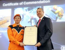 【ロンドン共同】ロンドンの国際海事機関(IMO)本部で24日、人命救助で功績を挙げた個人や団体の表彰式が開かれ、日本の海上保安庁特殊救難隊も表彰された。昨年11月に神戸港で貨物船と衝突し、転覆した作業船の奨栄丸から乗組員の男性を救出した。