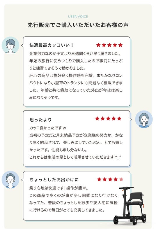 デザイン性の高さと簡単な操作、折り畳みができる点はROBOOTER J+VISIONの魅力です。今後もROBOOTER J+VISIONが、「カジュアルに移動できる歩行領域スクーター」として普及していくように活動してまいります。