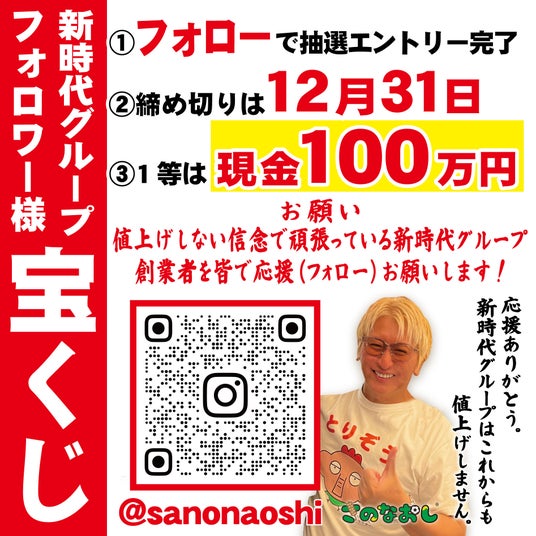 新時代グループフォロワー様宝くじ開催!応募締め切りは2025年12月31日23:59。エントリー方法は新時代グループ創業者さのなおしのInstagram(@sanonaoshi)フォローするのみです。