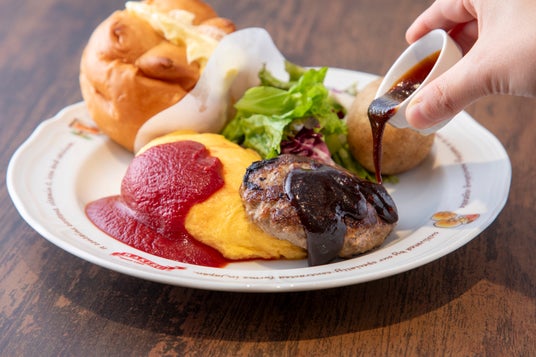 店舗名:ラケル、商品名:KUKUオムライスとハンバーグ(つけてみそVer.)、価格:1,639円、いつもの味が変わる、味噌ソースにトライ。