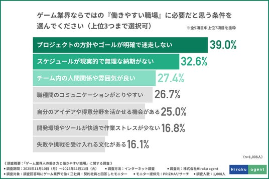 「ゲーム業界ならではの『働きやすい職場』に必要だと思う条件」について尋ねたところ、『プロジェクトの方針やゴールが明確で迷走しない(39.0%)』『スケジュールが現実的で無理な納期がない(32.6%)』『チーム内の人間関係や雰囲気が良い(27.4%)』が上位になりました。