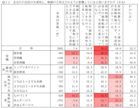 ○ 生産性に対する物価上昇の影響(Q11)については、「原材料費などコスト増加分並みの価格転嫁しかできておらず、生産性が変わっていない」(36.6%)が最多。「物価上昇に伴い、サービスや品質の改善を価格に転嫁できるようになり、生産性も上昇している」という、環境変化を好機として捉える回答は、全体では7.0%だが、経営層(14.1%)やものづくり(10.2%)では比較的多くなっている。(P.7)
