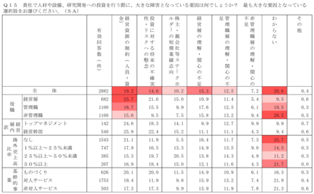 ○ 人材や設備、研究開発投資の障害となっている要因(Q15)については、「わからない」が20.6%で最も多く、「経営資源の制約(人員・資金)」が19.2%と続く。「経営資源の制約(人員・資金)」は経営層で最も多く、役職が上がるほど回答が多い。(P.12)