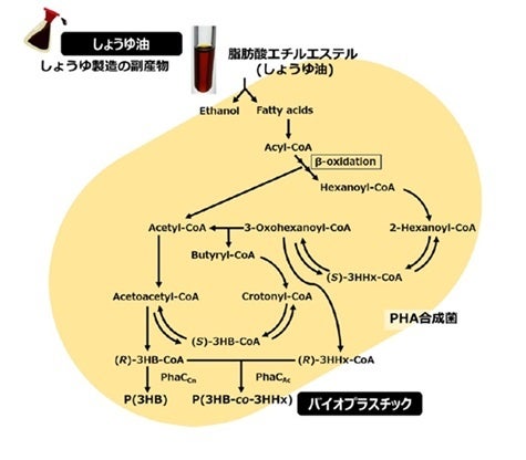 本成果を基盤として、PHA合成菌の遺伝子組換えや、大スケールでの最適な培養条件を検討してPHA生産性を工業化レベルまで向上させることで、しょうゆ油を原料としたPHA合成法の実用化を目指します。