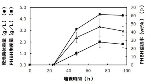 図4:しょうゆ油を原料とした生分解性プラスチックであるP(3HB-co-3HHx)の合成と菌体重量の推移