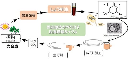 生物資源を原料としてオールバイオプロセスで微生物合成される生分解性バイオプラスチックであるポリヒドロキシアルカン酸(PHA)は、新たな環境調和材料として注目されています。PHAは、バイオマス由来の糖や油を原料として生合成することが可能であり、近年、原料コストの削減や、製造・加工場で生じる副産物を処理できるといった廃棄物レスなどの相乗効果を加味し、従来は廃棄物とされていた物質をPHA合成の原料とする様々な試みがなされています。本研究では、醤油製造過程で副産物として生じ、使用用途の限られていたしょうゆ油を、PHA合成の原料とすることを目指しました。