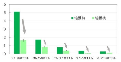 しょうゆ油を分析したところ、リノール酸エチル、オレイン酸エチル、パルミチン酸エチル、リノレン酸エチル、ステアリン酸エチルが含まれていました。PHA合成する前の培養前と、PHA合成が終了した培養後の各脂肪酸エチルエステル量を比較しました。結果としては、すべての脂肪酸エチルエステルが減少していることが分かりました。よって、しょうゆ油を用いたPHAの微生物生合成においては、脂肪酸エチルエステルが生合成に寄与していることが明らかとなりました。
