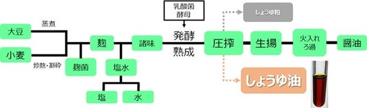 大豆、小麦、塩、水を原料とし、麹菌や乳酸菌、酵母などが働き醤油は醸造されます。その過程のうち、醤油の素となる『生揚(きあげ)』を得る目的で、諸味(もろみ)を圧搾(あっさく)致します。その際に得られる副産物として、『しょうゆ粕』、『しょうゆ油』が得られます。しゅうゆ油は褐色の透明な液体で、油溶性です。