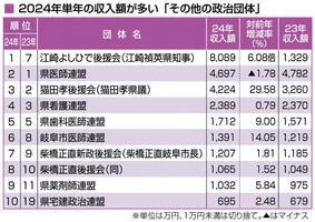 その他の政治団体収入額 知事後援会トップ 県医師連盟は2位