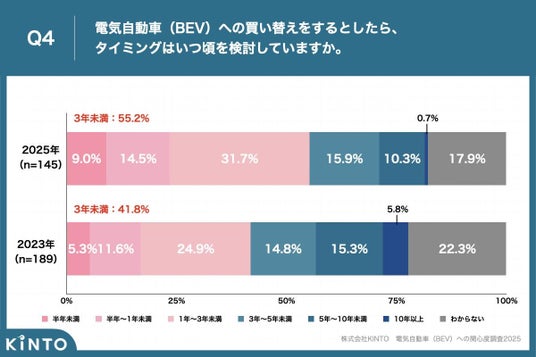 電気自動車(BEV)への買い替え時期、55.2%が「3年未満」を想定、23年の41.8%に対して13.4ポイントアップ
