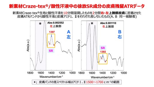 上腕皮膚を整えた後、30mm角のCraze-tex(R)生地を酸性人工汗液(pH5.6、1000µL)で湿潤して2分間貼布しました。貼布直後から経時にて皮膚部位のATR-FTIRスペクトルを取得し、アミドI/II並びに水分を差引処理後、1398cm⁻¹付近のセリシン由来バンドを定量指標として評価しました。並行して、角層水分・皮膚温・皮膚pHの変化も短時間モニタリングしています。