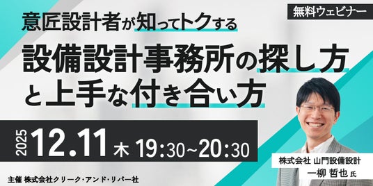 株式会社クリーク・アンド・リバー社(C&R社)は12月11日(木)、意匠設計に関わる企業・建築士・設計者の皆さまに向けた無料のオンラインセミナー「意匠設計者が知ってトクする設備設計事務所の探し方と上手な付き合い方」を開催します。