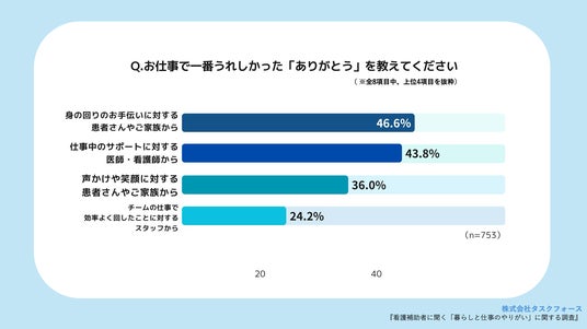 「お仕事で一番うれしかった「ありがとう」を教えてください」(n=753、複数回答)と質問したところ、1番多かった回答は、『身の回りのお手伝いに対する、患者さんやご家族からの「ありがとう」』(46.6%)でした。次いで、『仕事中のサポートに対する、医師・看護師からの「ありがとう」』(43.8%)、『声かけや笑顔に対する、患者さんやご家族からの「ありがとう」』(36.0%)という結果になりました。