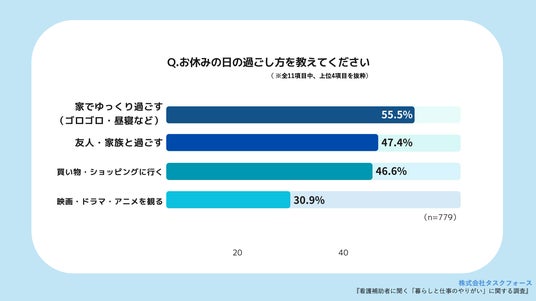 「お休みの日の過ごし方を教えてください」(n=779、複数回答)と質問したところ、最も多かった回答は「家でゆっくり過ごす(ゴロゴロ・昼寝など)」(55.5%)、次いで「友人・家族と過ごす」(47.4%)でした。また、「買い物・ショッピングに行く」(46.6%)、「映画・ドラマ・アニメを観る」(30.9%)が続きました。