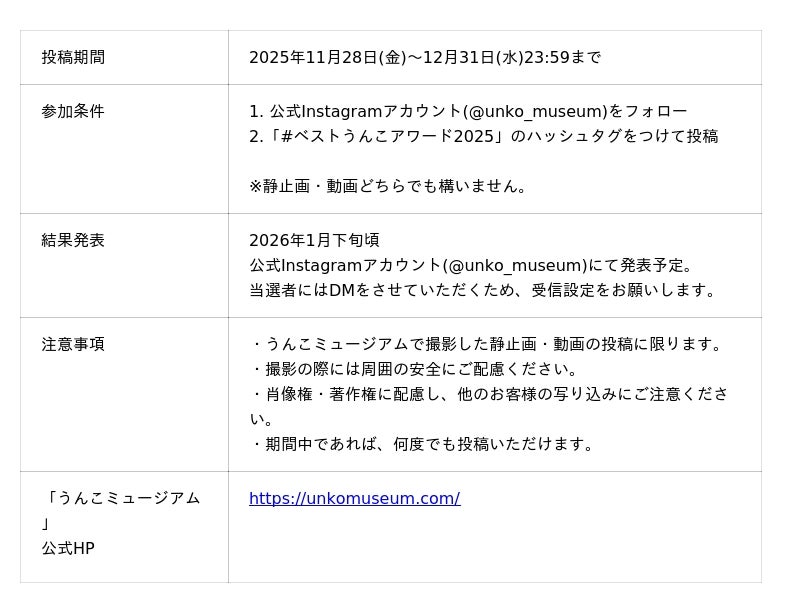株式会社カヤック(本社:神奈川県鎌倉市、代表取締役CEO:柳澤大輔、東証グロース:3904、以下「面白法人カヤック」)と、体験型エンターテインメント施設「うんこミュージアム」を共同で展開する株式会社たのしいミュージアム(本社:東京都渋谷区、代表取締役:小林将)は、2025年11月28日(金)より、「うんこミュージアム TOKYO」「うんこミュージアム NAGOYA」「うんこミュージアム OKINAWA」にて、Instagram(インスタグラム)を活用したフォトコンテスト「ベストうんこアワード 2025」を開催します。