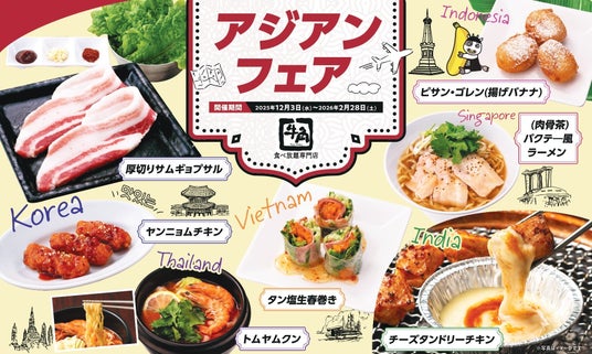 こうした背景を踏まえ「牛角食べ放題専門店」では、定番の食べ放題メニューに加え、全6カ国の名物グルメを楽しめる「アジアンフェア」を期間限定で実施いたします。1回の食事で各国のグルメを食べ比べでき、まるで“海外グルメ旅”のような体験を気軽に楽しめる点も本フェアの魅力です。年末年始の外食需要が高まる時期に、寒い季節にぴったりの“あったか×韓国×エスニック体験”をお届けします。