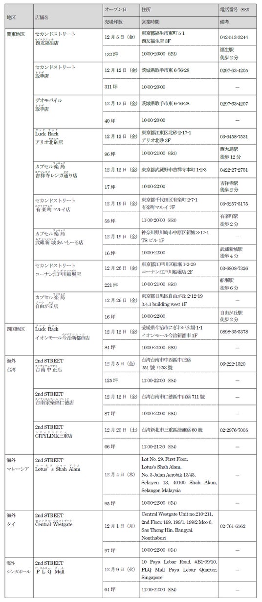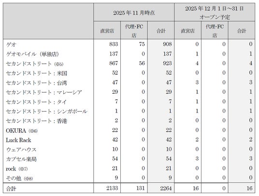 新たに、「セカンドストリート」10店舗、「ゲオモバイル」1店舗、「ラックラック」2店舗、「カプセル楽局」3店舗の合計16店舗が2025年12月度にオープンします。
