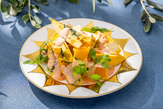 そばに生ハムやセルバチコなど、洋の食材を組み合わせた新感覚のサラダ。オレンジの爽やかな酸味とそばの香りが軽やかに重なり、華やかな一皿。