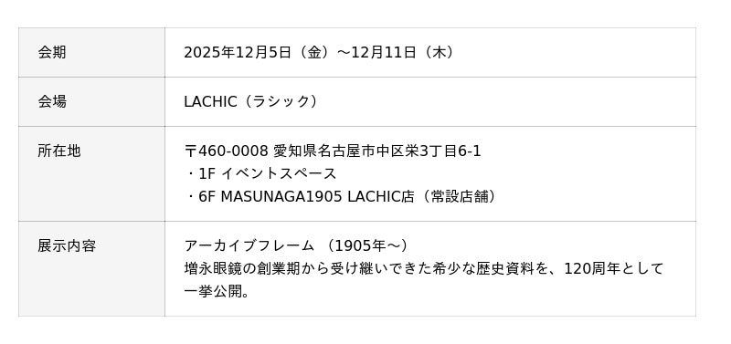 名古屋LACHICでは特別展示イベント「MASUNAGA1905 120th Anniversary × MASUNAGA MOC New Collection Launch」を12月5日(金)から12月11日(木)まで開催。増永眼鏡の歴史・技術・未来を一度に体験できる構成となっています。1905年の創業期から受け継がれてきたアーカイブフレーム11点を一挙公開し、120年にわたるデザインと技術の変遷を紹介。また、120周年記念モデル「Edition120」は、こうした歴史的アーカイブの“進化版”として位置づけられ、伝統と革新が同時に立ち現れる展示構成となっています。「最高傑作は次回作」という哲学のもと、過去と未来が交差する120周年ならではの特別展示です。