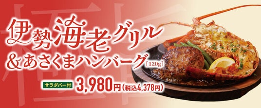 株式会社あさくま(本社:愛知県名古屋市/代表取締役社長:廣田陽一)は、「ステーキのあさくま」店舗にて、冬のご褒美にぴったりな限定メニュー「伊勢海老グリル&あさくまハンバーグ特別セット」を期間限定および店舗限定で、12月3日(水)より販売開始いたします。