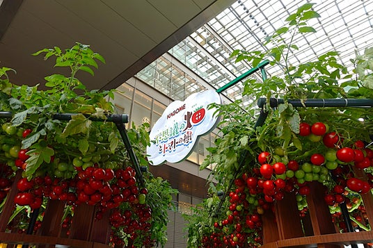 <「トマトの樹」について>「トマトの樹」の技術を保有し、今回のイベントにも協力している協和株式会社ハイポニカ事業本部にて大切に水気耕栽培で育てられた「トマトの樹」を、各会場に設置しました。太陽の光をたっぷりと浴び、元気いっぱいにたわわに実をつけ生長した「トマトの樹」は、「カゴメ野菜生活ファーム富士見」の人気コンテンツです。たくさんのトマトが頭上をおおう不思議な空間は、フォトスポットとしても大人気です。