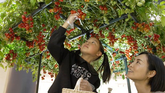 <トマトの無料収穫体験>たくさんのトマトが頭上を覆う、これまでにない不思議な空間を体験できる「トマトの樹」を各会場に設置しました。トマトの無料収穫体験は例年大好評をいただいています。約1,000個以上の実をつけた「トマトの樹」から収穫したトマトは、そのままお持ち帰りいただけます。収穫できるトマトはミニトマトに加え、一回り大きい中玉トマトもご用意。現地ではスタッフが収穫のサポートを行うため、小さいお子様でも気軽に体験いただけます。