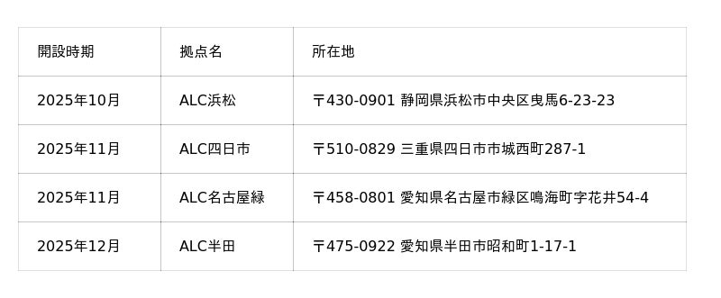 既に岡崎市・刈谷市・豊田市・西尾市・豊川市・岩倉市・春日井市の7拠点があり、今回の4拠点同時OPENと合わせ計11拠点とエリアを拡大します。
