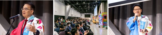 (左から)愛知県知事 大村氏、会場全景、STATION Ai株式会社 代表取締役社長兼CEO 佐橋