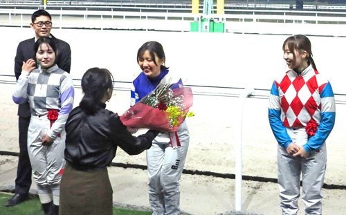 小笠原騎手は笠松ラウンドに続き、名古屋最終戦で2勝目を挙げて総合V。深沢騎手は第2戦も7番人気馬で4着に食い込み、総合2位に入った。佐々木世麗騎手(兵庫)が3位に踏ん張り、3人は晴れの表彰台に上がり、スマイル全開で輝いた。