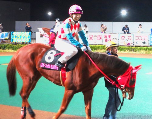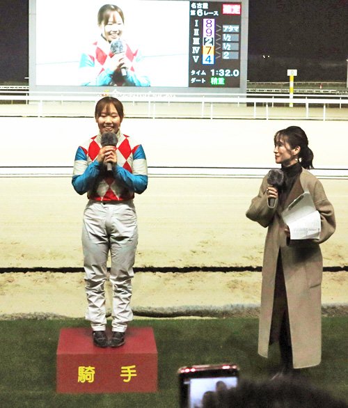 ゴールの瞬間は「ハナぐらいは出ていて、勝ったのが分かった。(騎乗馬の)8番が表示されて良かったです」。名古屋での騎乗は増えており通算6勝目。「普段から名古屋でも乗っていて良かった。(コース取りは)内から外に出さないといけないから。相手は瞳さんと璃菜ちゃんだと思っていた」。4位から30ポイント上乗せでトップとは7ポイント差の総合2位に浮上。2着で総合5位に上がった塩津騎手と健闘を誓い合い「優勝のチャンスありますね。ここまで来たからには勝ちたいですね。頑張ります」と闘志。ファンが差し出す多くの色紙にサインで応えていた。
