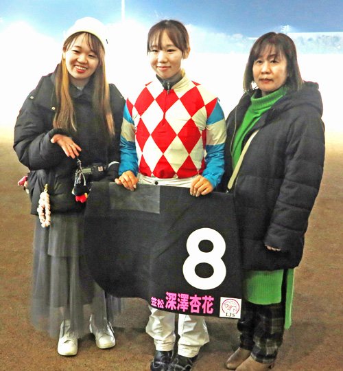深沢騎手は兵庫県姫路市出身でお母さん、お姉さんら家族も応援に駆け付けて、記念撮影で喜びを分かち合った。お母さんは大接戦だったゴールの瞬間「心臓がもうドキドキ、バクバクしていました。初めての感覚でしたね」と大喜び。