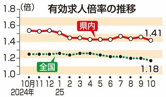 岐阜労働局が28日発表した10月の県内有効求人倍率(学卒を除きパートを含む、季節調整値)は、前月を0・05ポイント下回る1・41倍で、2カ月ぶりに低下した。実際に就業する地域で集計した「就業地別」は、前月を0・01ポイント下回る1・47倍だった。