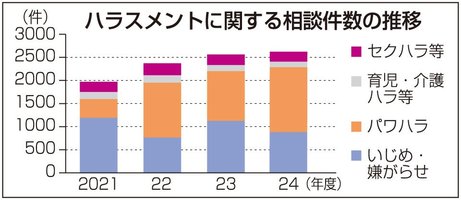 岐阜労働局に2024年度に寄せられた職場のハラスメントに関する相談件数は、23年度比2・6%増の2625件となり、現行の方法で統計を取り始めた16年度以降、4年連続で過去最多を更新した。増加の背景について同労働局は、労働施策総合推進法(通称・パワハラ防止法)で中小企業にもパワハラ防止措置が22年4月から義務化され、制度の周知が進んだためとしている。