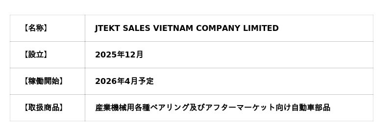 株式会社ジェイテクト(本社:愛知県刈谷市、取締役社長:近藤 禎人、以下「ジェイテクト」) は、近年、産機分野およびアフターマーケットにおけるベアリング需要が伸長しているベトナムでの販売網強化を目的に、ベトナムのハノイとホーチミンにJTEKT SALES VIETNAM COMPANY LIMITEDを新設いたします。