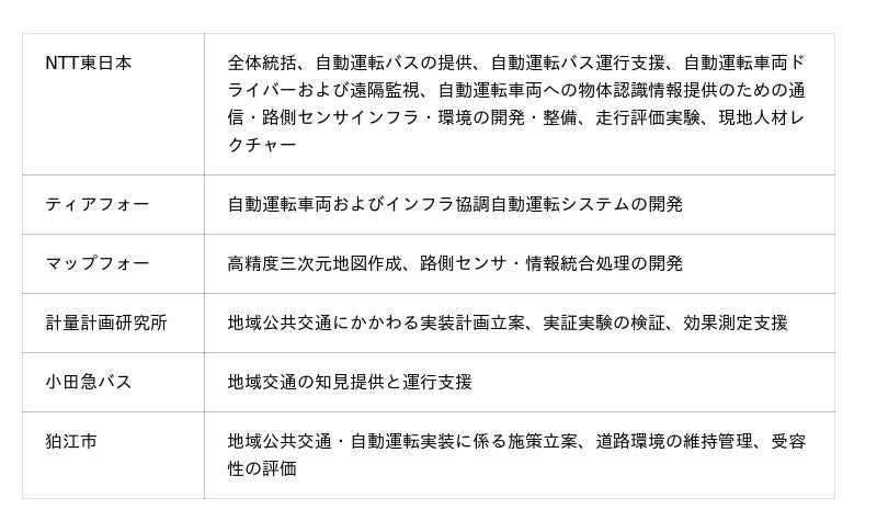 代表機関を務めるNTT東日本株式会社 (代表取締役社長 澁谷 直樹 、以下「NTT東日本」) 、株式会社ティアフォー(代表取締役執行役員 CEO 加藤 真平、以下「ティアフォー」)、株式会社マップフォー(代表取締役 田中 一喜、以下「マップフォー」)、一般財団法人計量計画研究所(代表理事 岸井 隆幸、以下「計量計画研究所」)、小田急バス株式会社(取締役社長 田島 寛之、以下「小田急バス」)、東京都狛江市(市長:松原 俊雄、以下「狛江市」)の6者で構成されるコンソーシアムは、総務省「地域社会DX推進パッケージ事業(自動運転レベル4検証タイプ)」の実証団体に選定※2され、昨年度より、実証地域(狛江市)の都市型交通事情に応じた見通しの悪い交差点等の歩行者や車両の認識等、スムーズな自動運転実現のために実証を進めてまいりました。今年度は、認識情報を自動運転の走行制御まで一貫して連携させるシステムを開発し、よりスムーズな走行を実現する実証を進めております。