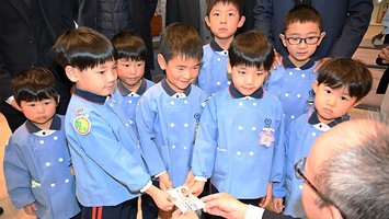 スマホ見せてグルメ・買い物お得に 岐阜新聞デジタルクーポン初日はかぐや第一こども園(岐阜市入舟町)とかぐや第三幼稚園・保育園(同市粟野西)の園児や保護者らが岐阜新聞本社を訪れ、各園で行ったバザーの収益金の一部として計5万円を届けた。園児8人が「大切に使ってください」と元気な声で述べ、担当者に手渡した。