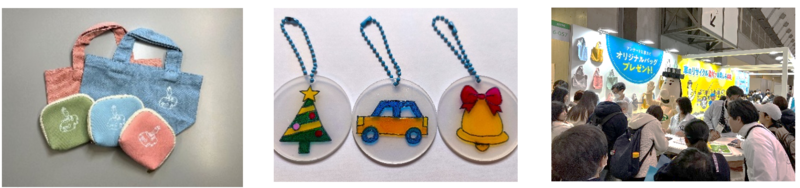 <オリジナルグッズ例> <キーホルダー例> <昨年度出展の様子>