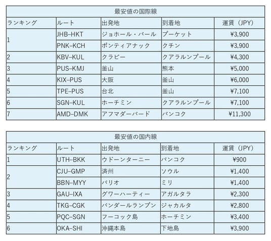 調査の結果、アジア全体で見ると、国際線ではマレーシアとインドネシアが最もお得な航空券を提供しており、運賃は約3,000円台からとなっています。国内線ではタイが最も手頃で、約900円台から利用できるの路線が見つかりました。 日本でも魅力的な低価格路線が見られ、 日本発の国際線では「大阪-釜山線」間が約6,000円台と最もリーズナブル。一方、国内線では 「沖縄本島-下地島線」が約3,000円台から利用でき、南国の島々を気軽に巡る年末旅行ルートとして人気を集めています。